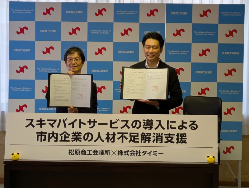 松原商工会議所(大阪府、松岡義則会頭・松岡特殊印刷)は8月5日、スキマバイトサービスを展開するタイミーと連携協定を締結した。同協定は、松原市内の企業が抱える人手不足の解消を目的としたもの。同所が5月に市内企業を対象として実施した調査では、約半数が人手不足と回答しており、企業が若手人材の獲得・定着に苦慮している現状が明らかになった。同所は若年層の利用が多いタイミーの活用を促進し、一時的な人手不足の解消に加えて、継続的な雇用にもつなげることで恒常的な人材不足対策を支援していく。タイミーとの連携協定の締結は、大阪府内の商工会議所としては初めてとなる。