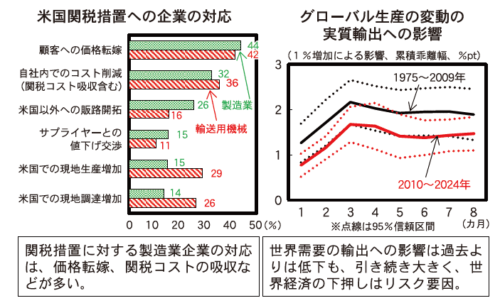 今年の白書は、「日本経済の動向と課題」「賃金上昇の持続性と個人消費の回復に向けて」「変化するグローバル経済とわが国企業部門の課題」の3章で構成。第1章では、米国による関税措置の影響について、「輸出企業に対する直接的な影響に加え、世界経済の下押しを通じて間接的にもわが国経済を下振れさせる大きなリスクとなっている点に留意が必要」との見方を強調。国内産業への影響を勘案し、資金繰り支援など必要な対策を万全に構じていくことにより、その影響を最小限に抑える重要性を指摘した。