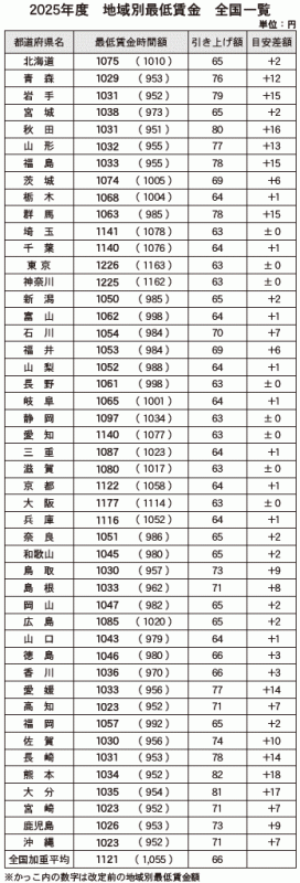 厚生労働省は9月5日、地方最低賃金審議会が答申した2025年度の地域別最低賃金の改定額を公表した。厚生労働大臣の諮問機関である中央最低賃金審議会が示した「地域別最低賃金額改定の目安について」などを参考に、各地方最低賃金審議会が審議した結果、改定額の全国加重平均は1121円となり、昨年度の1055円から66円増。過去最大の引き上げ額を更新し、最低賃金は全ての都道府県で1000円の大台を超えた。また、39県が中央最低賃金審議会の示した引き上げ額の目安を上回った。