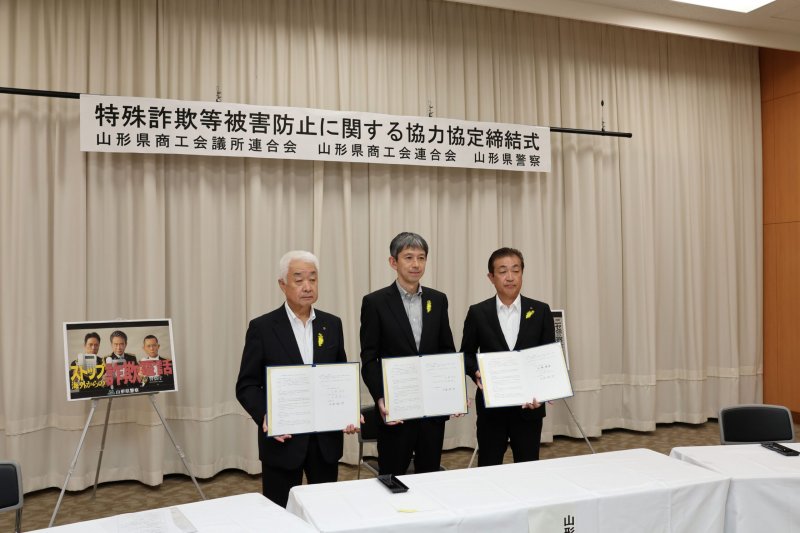 山形県商工会議所連合会(矢野秀弥会長・山形商工会議所会頭・山形丸魚)は9月29日、山形県警察、山形県商工会連合会と特殊詐欺などによる被害防止のための協力に関する協定を締結した。同協定は、県内で特殊詐欺やランサムウェア感染などによる被害が発生していることを踏まえ、3者が相互理解を深め、強固な協力関係を構築して特殊詐欺などの被害防止対策に取り組み、県民や県内企業にとって安全で安心な地域社会を実現することが目的。
