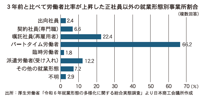 正社員以外の労働者を活用する理由(複数回答)は、「正社員を確保できないため」(41.0%)、「即戦力・能力のある人材を確保するため」(31.6%)、「1日、週の中の仕事の繁閑に対応するため」(29.1%)が上位。正社員以外の労働者を活用する上での問題点(複数回答)は、「良質な人材の確保」(53.6%)、「定着性」(51.5%)、「仕事に対する責任感」(46.1%)が上位だった。