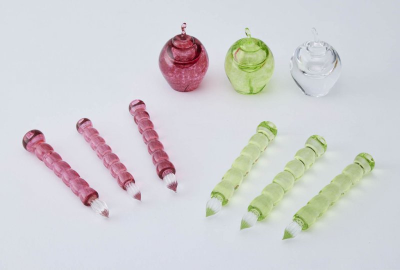今月は、青森県を代表するモチーフ「リンゴ」をイメージしたインク壺とガラスペンをご紹介します。