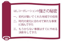 「創業者の枦(はし)庄右衛門は私の祖父で、私で三代目になります。祖父は裸一貫で個人商店を始め、昭和に入るとでんぷん工場を立ち上げました。戦後には枦産業合資会社を設立し、1960年には県内にでんぷん工場11カ所、水あめ工場1カ所にまで拡大し、ピーク時には資本金5千万円、年商6億円にまで発展させていきました。従業員も450人ほどいたそうです」と、はしコーポレーション取締役会長の枦壽一さんは言う。