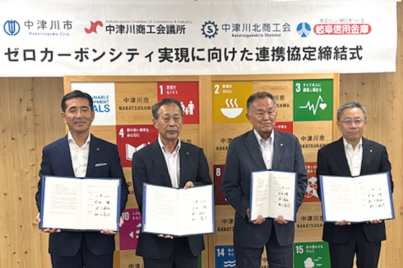 中津川商工会議所(岐阜県)は7月30日、中津川市、中津川北商工会、岐阜信用金庫とゼロカーボンシティーの実現に向けた連携協定を締結した。環境に関する情報の共有、事業の推進などを通じて相互の連携を強化し、2050年のゼロカーボンシティーとサーキュラーエコノミー(循環型経済)の実現を目指す。
