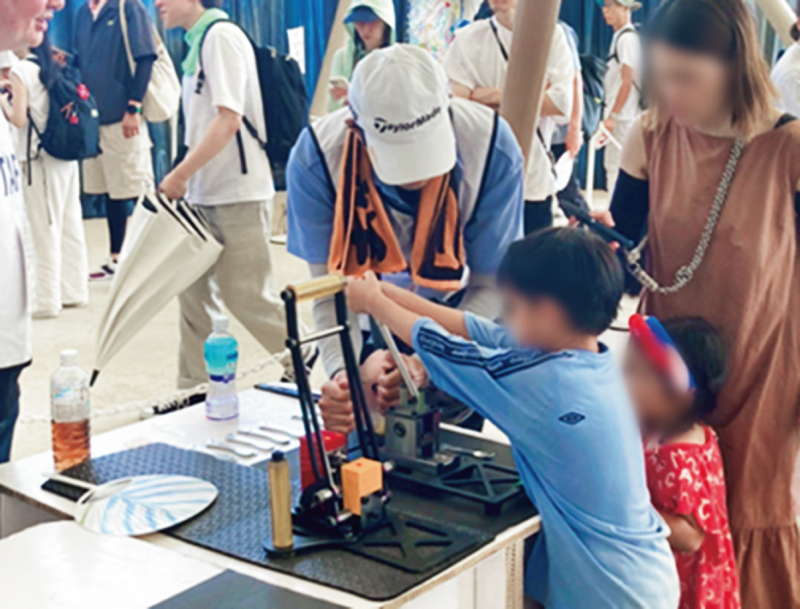 当日は子どもたち105人が参加。海外の子どもたちには英会話ができるスタッフが対応し、スプーンの形をしたアルミニウムの平板をハンドプレス機などでプレス、加工し15分ほどでオリジナルのスプーンを作成した。子どもたちはハンドプレス機でスプーンの形になる工程に驚いたり、スプーンの研磨に夢中になったりとものづくりの工程を楽しんだ。