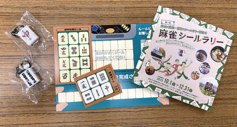 シールラリーは市内の飲食店38店舗が参加。対象店舗で1人当たり1000円以上の買い物、飲食をするともらえるマージャン牌シールを集め、手持ちの牌シールと合わせて役を完成させると役に応じて景品と交換できる。また、役が完成しなくてもシールを14枚集めるとマージャン牌キーホルダーがもらえる。