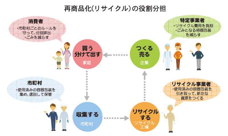 「消費者」はごみを分別して出す、「市町村」はそれを分別収集・選別する、そして容器包装を利用・製造する「特定事業者」は「再商品化事業者」と協力して再商品化(リサイクル)する――という明確な役割分担の下で制度が機能しています。