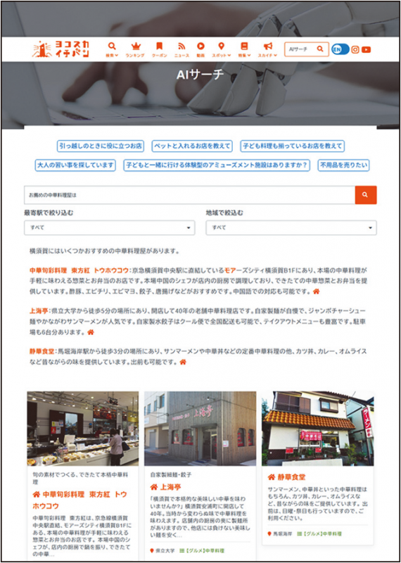横須賀商工会議所(神奈川県)はこのほど、同所が運用している地域ポータルサイト「ヨコスカイチバン」の新サービス「AIイチバン」の運用を開始した。AIを活用した店舗検索機能の向上などにより、中小・小規模事業者の効果的な顧客開拓につなげる。