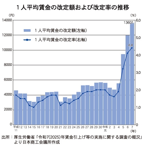 1人平均賃金の改定額・改定率の年次推移を見ると、いずれも2011年調査以降増加傾向で推移し、20、21年調査では減少したが、22年調査以降は増加している。