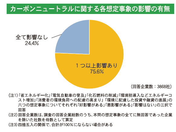 調査では、カーボンニュートラルに関する六つの想定事象(「省エネルギー化」「電気自動車の普及」「化石燃料の削減」「環境税導入などエネルギーコスト増加」「消費者の環境負荷への配慮の高まり」「環境に配慮した投資や融資の進展」)を設定し、それぞれについ て影響(好影響、悪影響、影響なし)を三択でヒアリング。一つ以上の事象で影響があると回答した割合は75・6%だった。