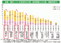 実施・検討に当たっての課題については、「規制やルールが決まっていない」が36・0%で最も多く、次いで、「対応コストが高い」(32・6%)、「対処方法や他社の取り組み事例などに関する情報が乏しい」(27・5%)の順で多かった。また、過去調査(23年7月、21年7月)と比較すると、「対応コストが高い」「現場の設備では対応が難しい」「社内に対応に必要な人材がいない」といった回答の割合が上昇傾向にあり、課題が浮き彫りとなる結果となった。