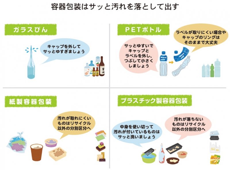 市町村ではそれぞれの設備や収集体制に合わせ、ごみの分別・排出ルールを定めています。収集日・分別区分・出し方などは市町村によって異なるため、地域のルールに従うことが第一歩です。容器包装を出す際は、中身を軽くゆすいだりして、汚れを簡単に落として排出することを心掛けてください。これにより容器に残った中身による臭気やカビの発生、汚れの再付着を防ぎ、リサイクル原料としての品質を高めます。