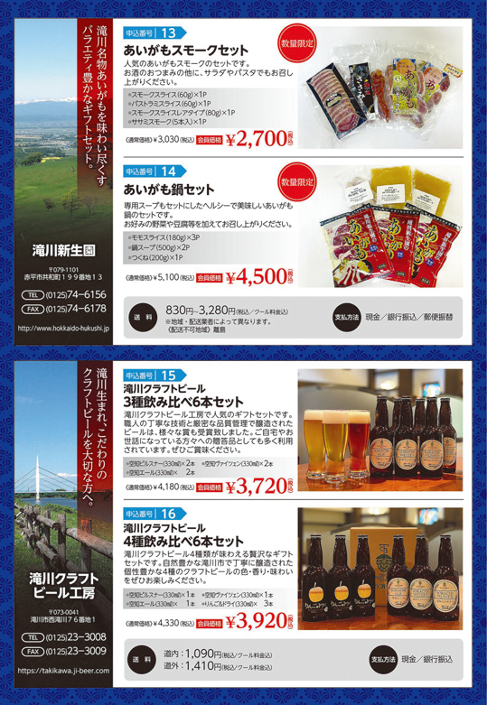 滝川商工会議所(北海道)はこのほど、会員事業所の商品を掲載したお歳暮用カタログ「たきがわギフトセレクション2025冬号」を作成した。同事業は会員事業所がお歳暮やお中元に使用する贈答品に滝川市内の事業所の商品を使用してもらおうと2023年度に開始。今回はジンギスカンやあいがも、北海道産の小麦粉を使用したパンセット、オホーツク産の毛ガニ、ホタテ、クラフトビールなど16商品などを掲載している。
