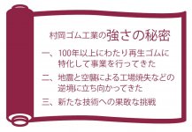 48年に村岡ゴム工業に改組し、51年に完成した市川本社工場には新しい設備を導入。再生ゴムの新商品開発を進めていった。後に二代目となる元一さんが経営に参加すると、乗用車用タイヤを再生ゴムの原料にする研究を始め、製品化に成功した。