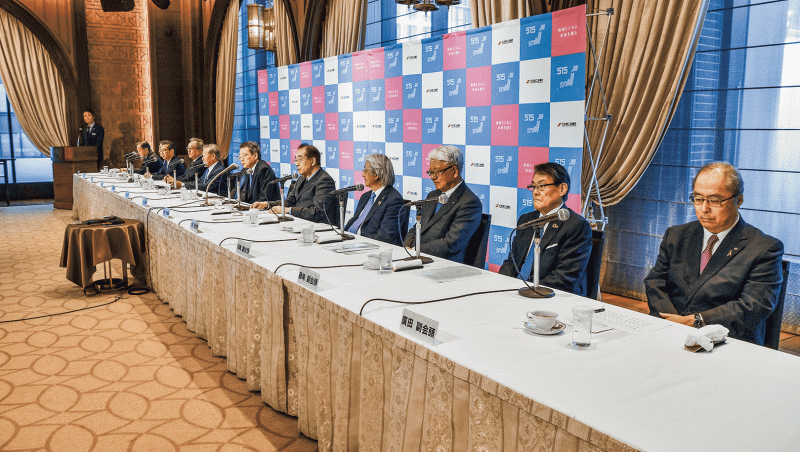 日本商工会議所の臨時会員総会で選任された小林健会頭は11月20日、11人の副会頭と共に臨時会員総会後に第期新体制で初めての記者会見に臨んだ。小林会頭は、「変革と価値共創による日本経済の再出発」をスローガンに掲げ、企業などの自己変革とともに、地域間や企業間の連携による共創を推進する方針を表明した。