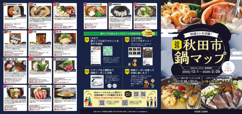 秋田商工会議所はこのほど、秋田市内で鍋を提供している店舗を紹介する「秋田市鍋マップ」を作成した。今回で2回目となる同事業は地元住民、観光客に冬の郷土料理である鍋料理を食べて市内の飲食店を巡ってもらい、冬の秋田を盛り上げるとともに、「食」の消費拡大を図ることが目的。市内の飲食店42店舗を鍋の種類ごとに色分けし、写真付きで紹介している。同所のほか、市内のホテルやJR秋田駅構内などで配布してい る。
