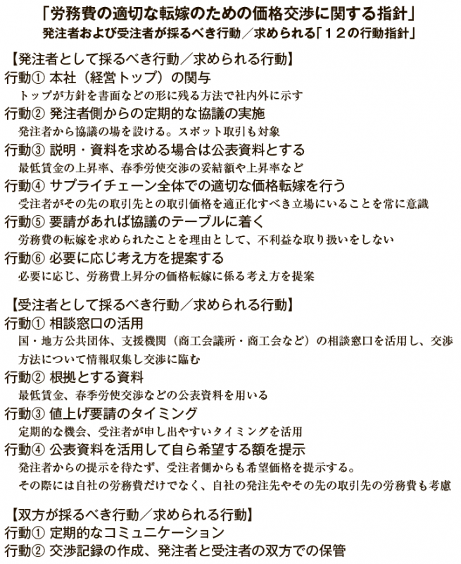 ②では、自社の取引を見直し、依然として価格転嫁率が5割程度にとどまる労務費・エネルギー費・原材料費の価格転嫁推進を求めているほか、サプライチェーン全体における価格転嫁の商習慣定着に向けた取り組みの必要性を主張。また、価格転嫁のみならず、支払い条件の適正化や優越的地位の乱用による悪しき商習慣からの脱却に向け、対等な取引関係の構築を目指すことを求めた。