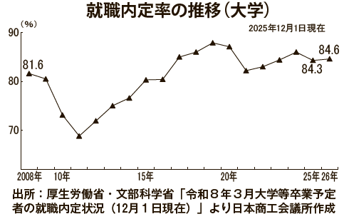 厚生労働省と文部科学省は1月23日、2026年3月の大学など卒業予定者の就職内定状況(25年12月1日現在)を取りまとめ、公表した。