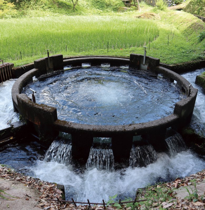 施設の一つである「円形分水」は、1934年に完成しました。以来、湧き出る水を円形の水槽に集めて、3つのスリット(水路)を通して周辺の田畑へ公平に分流しています。また、毎年春には水神祭が行われます。