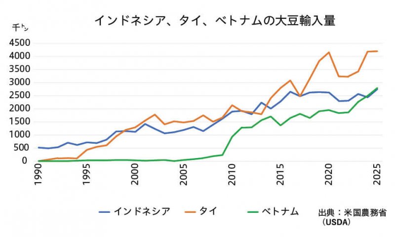 大豆は、かつては日本が世界最大の輸入国だった。1973年には米ニクソン政権が日本への大豆輸出を停止して、大混乱が起きた。今は、中国が年間1億t前後の大豆を輸入する最大の輸入国である。対中輸出では長年、米国とブラジルが競り合っていたが、トランプ第1次政権以降、中国は大豆の「脱米国」を進め、昨年は輸入の75%がブラジル産となった。トランプ政権は昨年10月、中国に2500万tの大豆輸入を認めさせたが、米国は中国需要の多くを失い、大豆農家は経営危機に直面している。