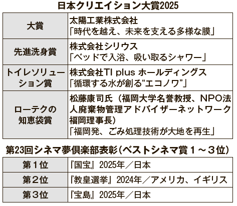 また、JFAは、日本クリエイション大賞の発表と同時に「第23回シネマ夢倶楽部表彰」の受賞作品も発表。25年に国内で公開された新作映画から「ベストシネマ」として第1位に『国宝』(日本)、第2位に『教皇選挙』(アメリカ、イギリス)、第3位に『宝島』(日本)を選定した。両賞の表彰式は3月24日に開催する予定だ。