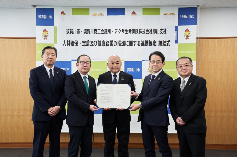 須賀川商工会議所(福島県、菊地大介会頭・あおい)は3月12日、須賀川市、アクサ生命郡山支社と人材確保・定着および健康経営の推進に関する連携協定を締結した。同事業は、事業者の生産性向上や人材の確保・定着および地域経済の活性化を図ることが目的。健康経営の推進は生産性の向上のみならず、企業のイメージアップや人材確保・定着に極めて重要な要素であるという認識の下、少子高齢化に伴う生産年齢人口の減少などによる人手不足が深刻化する中小企業の経営課題を3者で共有し、連携して地元事業所の健康経営の普及促進などに取り組む。