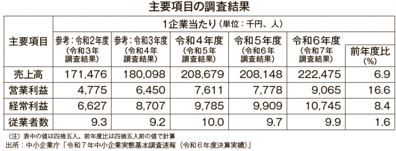 調査結果によると、1企業当たりの売上高は2.2億円(前年度比6.9%増)、1企業当たりの営業利益は907万円(同16.6%増)、1企業当たりの経常利益は1075万円(同8.4%増)だった。また、1企業当たりの従業者数は9.9人(同1.6%増)で、中小企業1企業当たりの売上高、営業利益、経常利益、従業者数の全てが増加した。