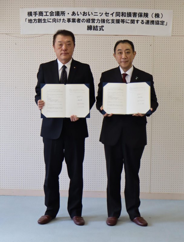 締結式で同所の渡部会頭は「現在、地域経済を取り巻く環境は、事業者にとって厳しい課題が山積している」と地域課題について説明。「あいおいニッセイ同和損害保険が有するリスクマネジメントや事業継続支援などの豊富な知見とネットワークを提供いただけることは横手市の地域経済にとって大変心強い」と述べた。「今後は、セミナーの開催、事業承継に関する相談体制の充実など具体的な取り組みを連携して進めていく。横手の企業がより強く、持続的に成長し、地域全体の活力向上につながってほしい」と期待を述べた。