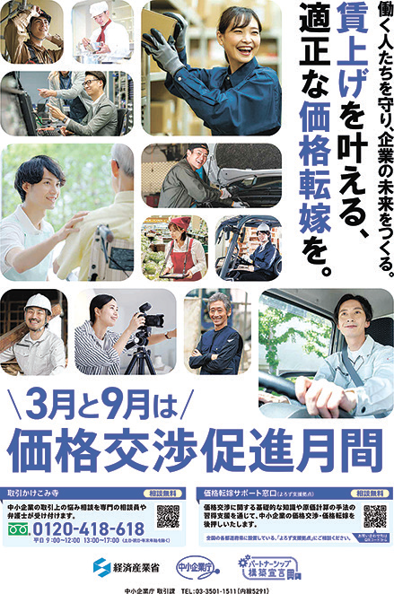 政府は3月と9月を「価格交渉促進月間」と位置付けて、受注側と発注側の企業間での価格交渉、労務費、原材料費、エネルギーコストなどの上昇分を適切に取引価格に転嫁することを呼び掛けている。