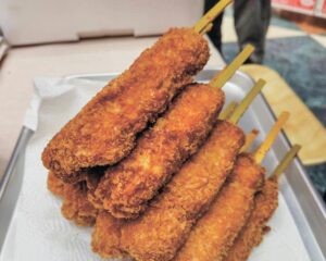米沢商工会議所青年部(山形県)は7月24日、地元食材を使ったB級グルメの祭典「Y―1グルメグランプリ」を開催した。7回目の今回は、主催する同所の70周年を記念し、市内に限っていた出店を置賜地域に拡大。前回を5店上回る計21の飲食店が創作料理を出品した。初参加は8店舗。米沢牛や館山リンゴなどの地元食材を使った品々が並んだ。近隣の長井市からは名物の馬肉ラーメンを使った肉まんなど変わり種も登場。バラエティに富んだ内容となった。1品当たり100~500円。料理を購入するごとに、投票権となる白豆が配られた。来場者の人気投票で、そばや伝右ヱ門の「もち天ぞう煮」がグランプリに輝いた。