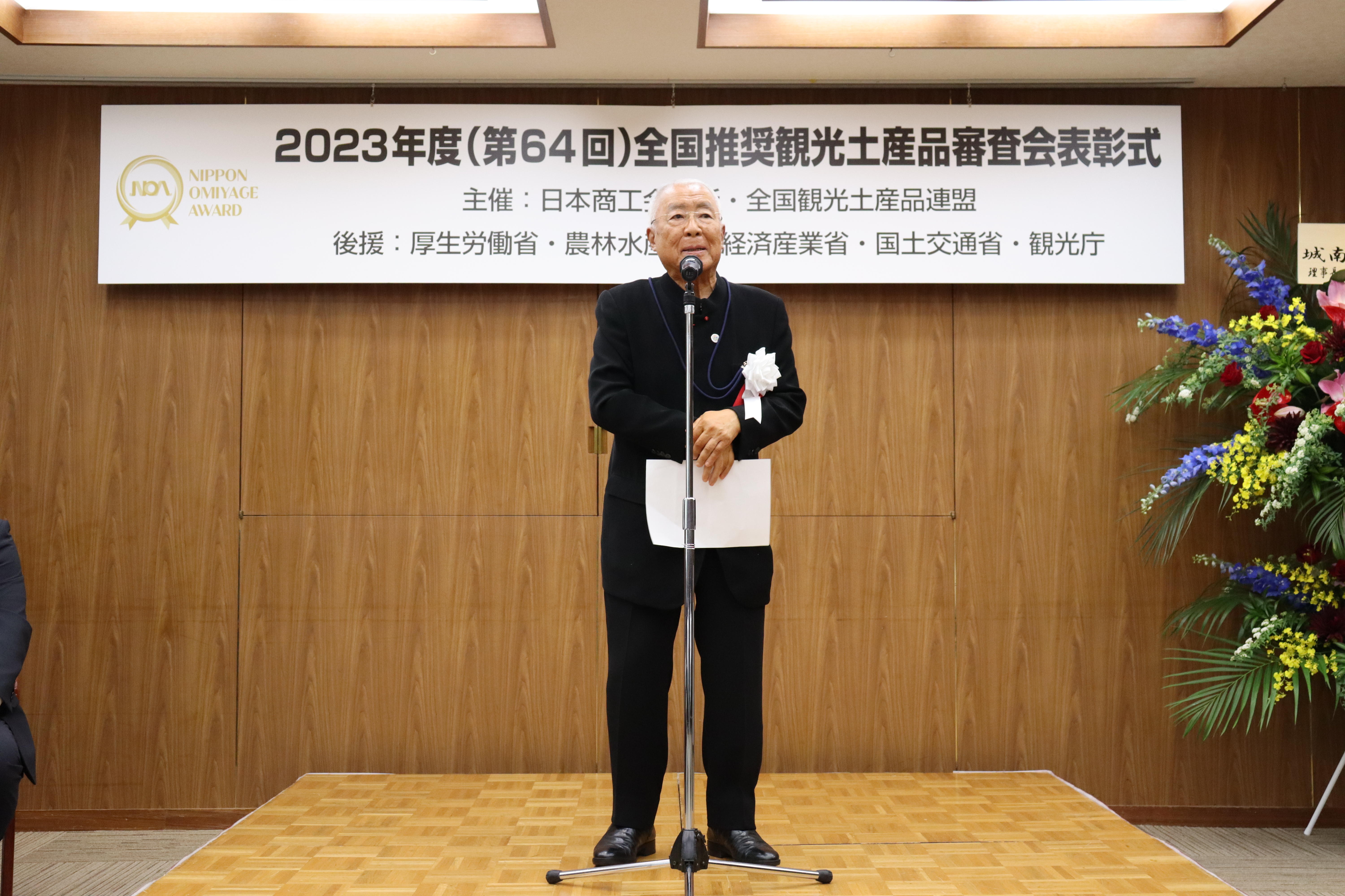 日本商工会議所と全国観光土産品連盟は2月20日、「2023年度(第64回)全国推奨観光土産品審査会」表彰式を都内で開催した。当日は、受賞企業や関係者ら約104人が出席。同連盟の細田眞会長のあいさつの後、審査委員長の服部幸應氏(学校法人服部学園 服部栄養専門学校理事長・校長)が審査講評を述べ受賞者らをたたえた。