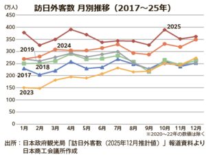 日本政府観光局(JNTO)は1月21日、2025年12月の訪日外客数が前年同月比3.7%増の361万7700人となり、12月として過去最高を記録...